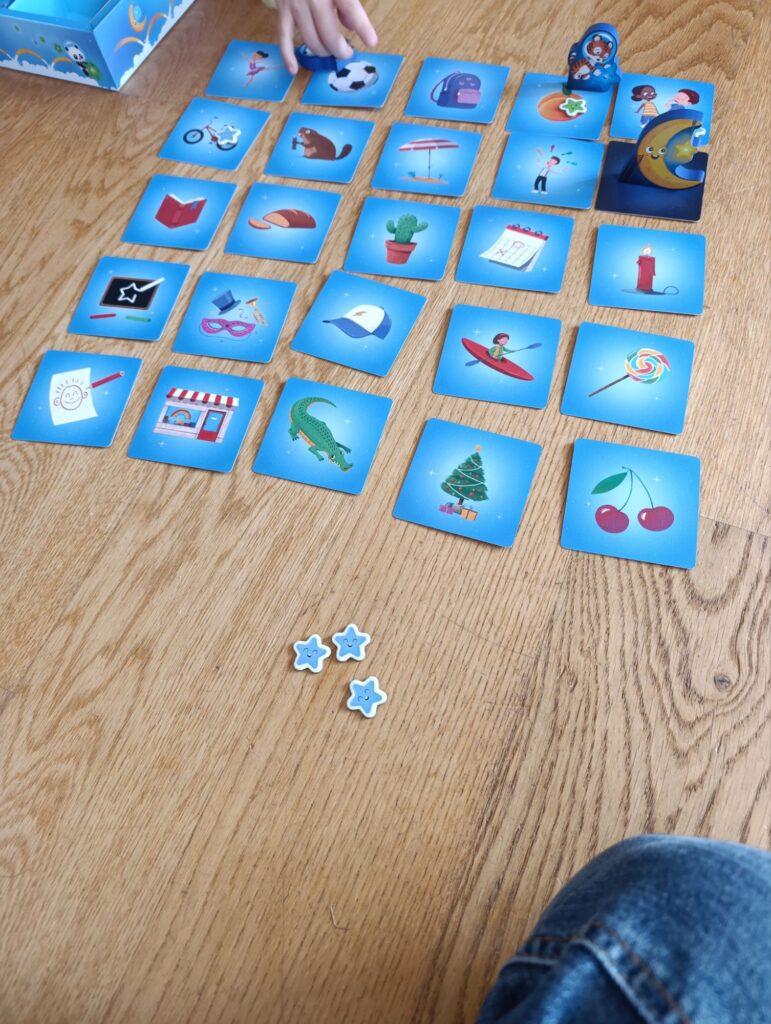 Die Altersempfehlung des Spiels ist auf 7 Jahre begrenzt. Das würde ich tatsächlich nicht so sehen. Schwierig ist es vielleicht, wenn die Mitspielenden sehr unterschiedliche Voraussetzungen haben, aber wenn ihnen dies bewusst ist und sie gegenseitig ein bisschen Rücksicht nehmen oder ein jüngeres Kind vielleicht nur drei Sterne sammeln muss, dann können sie auch wunderbar voneinander lernen.