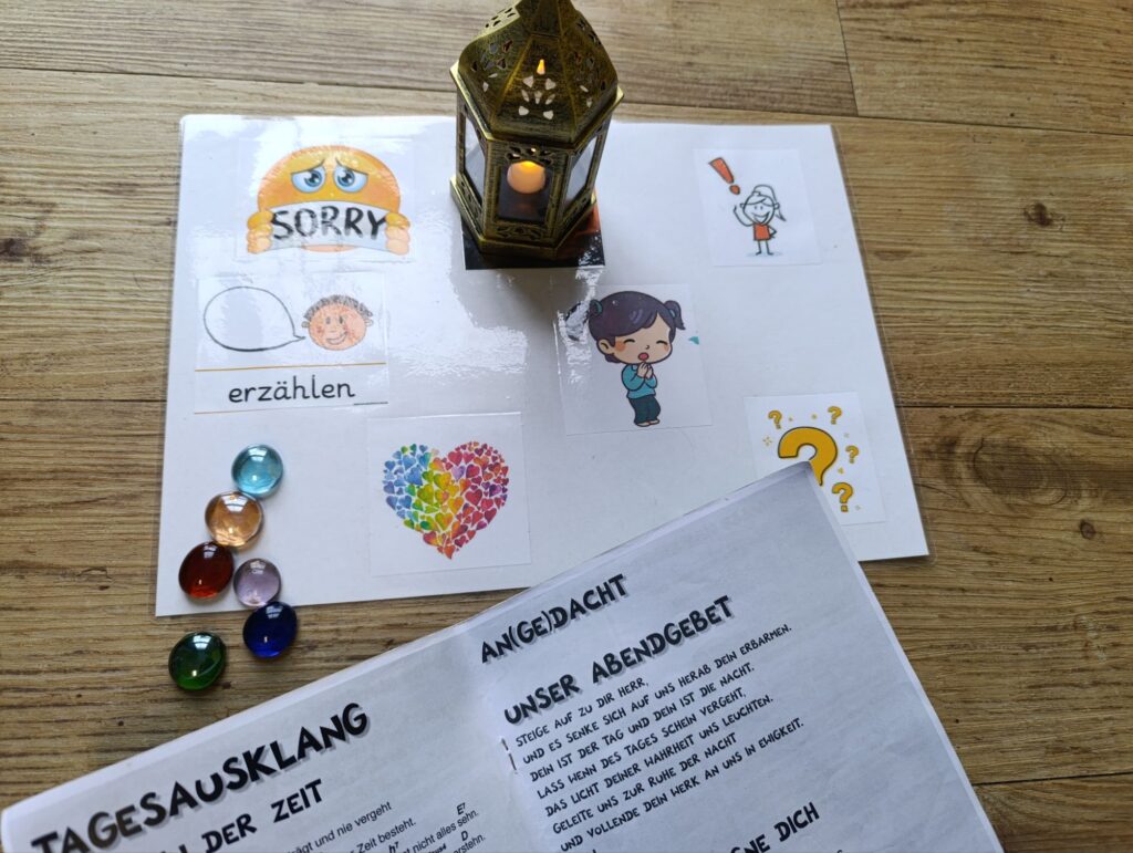 Wichtig ist mir, dass immer ein Stein von mir dafür verwendet wird, um zu sagen, dass ich das Kind lieb habe. Egal, was war. Das positive soll bei diesem Ritual grundsätzlich überwiegen. Und tatsächlich kommen Tipps und Bitten auch sehr selten vor. Die meisten unserer Steine landen auf dem Herz, der Sprechblase und dem Fragezeichen. Zum Abschluss sprechen wir dann noch gemeinsam ein Gebet, welches das Kind von einer Ferienfreizeit kennt.
