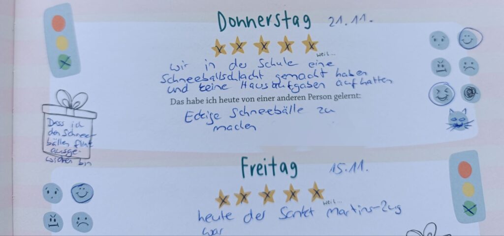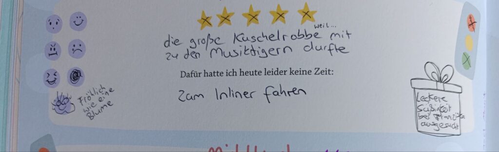 Das Ritual mit dem Buch wird den Kindern sehr schnell wichtig und sie fordern es schon nach wenigen Tagen ein. Schon bevor man das Buch aufschlägt, überlegen sie sich, wie viele Sterne der Tag bekommt und was sie sich selbst Gutes getan haben. Das ist übrigens die Kategorie, die ihnen am schwierigsten beim Ausfüllen fällt. Hier merkt man aber auch, dass ihnen immer bewusster wird, was ihnen selbst gut tut, oder auch wie sie ihre Gefühle besser benennen können, wenn man so etwas regelmäßig mit ihnen bespricht.