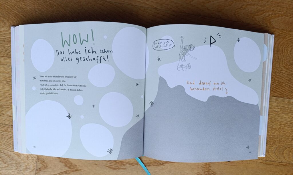 Meine Tochter hat das Buch nun auch und bei ihr wird jeden Tag – abwechselnd vom Papa und von mir – etwas reingeschrieben. Sie hat mit ihren 5 Jahren da sehr viel Freude dran und malt auch gerne etwas rein. Ich finde es sehr spannend zu sehen, wie und womit sie begründet, warum ein Tag für sie schön war.