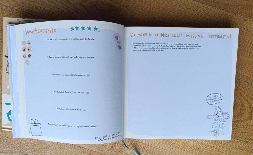 Die Sonntagsseite ist tatsächlich jede Woche gleich. Hier geht es um den gemeinsamen Lieblingsmoment der Woche, Momente, in denen man sich nicht so gut verstanden hat und wie man diese beim nächsten Mal anders angehen kann, worauf man stolz ist, was lustig war und was man sich für die nächste Woche vornimmt. Außerdem kann man auf der linken Seite noch Erinnerungen aus der Woche festhalten, z.B. Eintrittskarten einkleben, etwas aufschreiben oder malen.