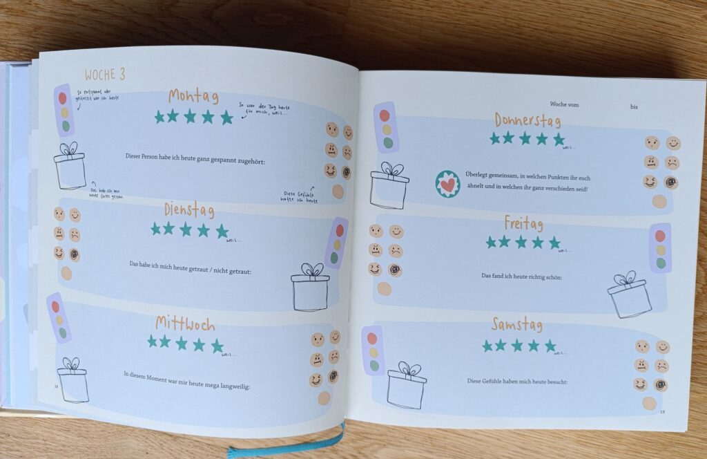 Zunächst kann man anhand von fünf Sternen sagen, wie der Tag grundsätzlich war. Anschließend kann dies noch schriftlich begründet werden. Es gibt eine Stressampel, Gesichter für die Gefühle des Tages sowie ein Geschenk, in das man schreibt oder malt, was man sich an dem Tag Gutes getan hat.
