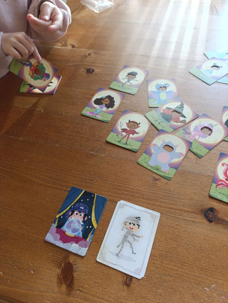Der Reiz des Spiels sind die verschiedenen Rollen, die hier gerne Runde für Runde gewechselt werden. Auch der Teil des Versteckspiels (Augen schließen und den Versteckspruch ‚Eckstein, Eckstein, alles muss versteckt sein‘ aufsagen) macht den Kindern unglaublich viel Spaß. Das Erinnern ist gar nicht so einfach, denn manche Kostüme sind ein wenig ähnlich. Die Wahrsagerin muss sich an die Visionen erinnern, um die verkleideten Monster zu enthüllen, aber auch die Monster müssen gut aufpassen, damit sie sich keine Verkleidung schnappen, die schon in den Visionen vorkam. Und da man nur solange Zeit hat sich zu verkleiden, während die Wahrsagerin die Augen geschlossen hat, muss man sich manchmal einfach schnell irgendeine Karte nehmen.