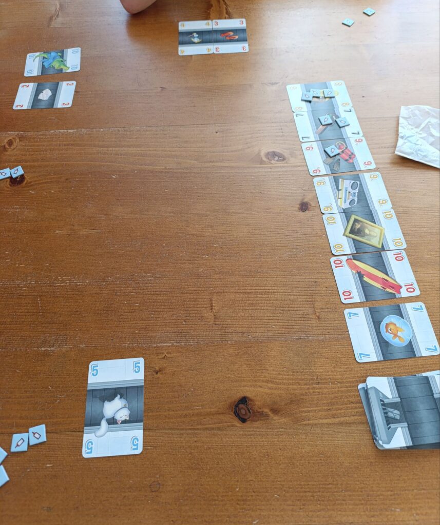 Am Ende gibt es Punkte für die ausliegenden Karten, wobei höhere Zahlen mehr Punkte geben als niedrige. Man muss also schon ein wenig stapeln. Zusatzziele bringen ebenfalls Punkte, während Karten auf dem eigenen Ablagestapel Minuspunkte sind.