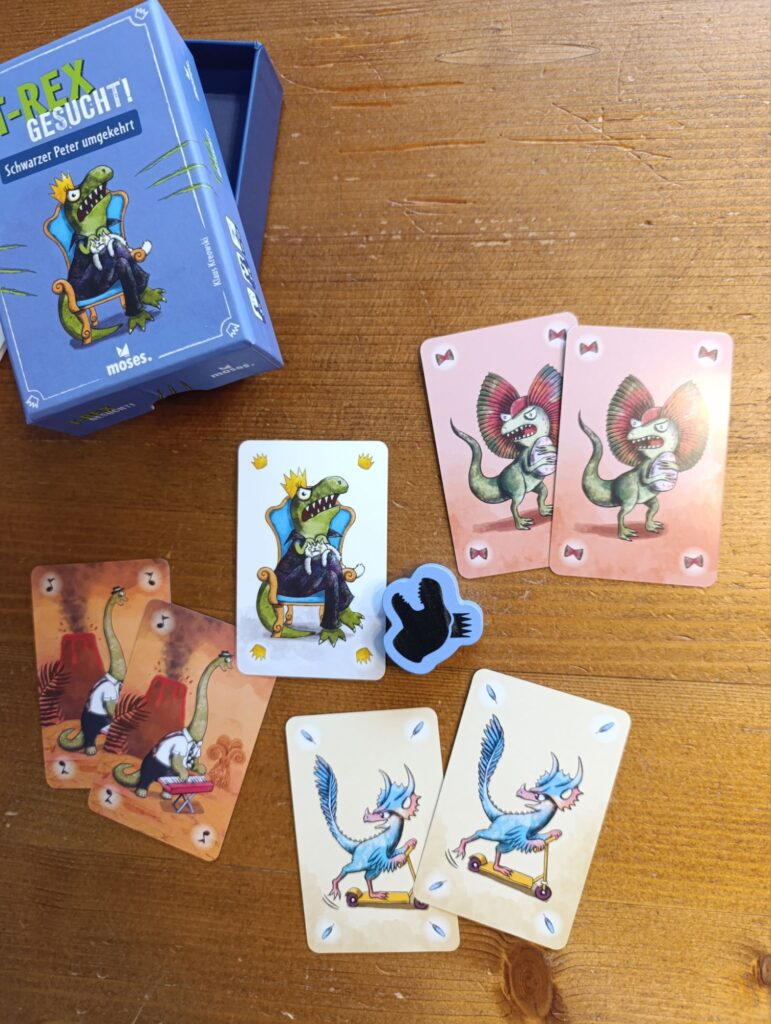 Der Untertitel der Spiele verrät eigentlich schon, wie die Spiele funktionieren: „Schwarzer Peter umgekehrt“. Es geht darum, dass man am Ende des Spiels nur noch eine bestimmte Karte auf der Hand hat. Je nach Spiel ist es der „T-Rex-König“ oder die „Einhorn-Prinzessin“. Alle anderen Karten werden während des Spiels als Pärchen abgelegt.